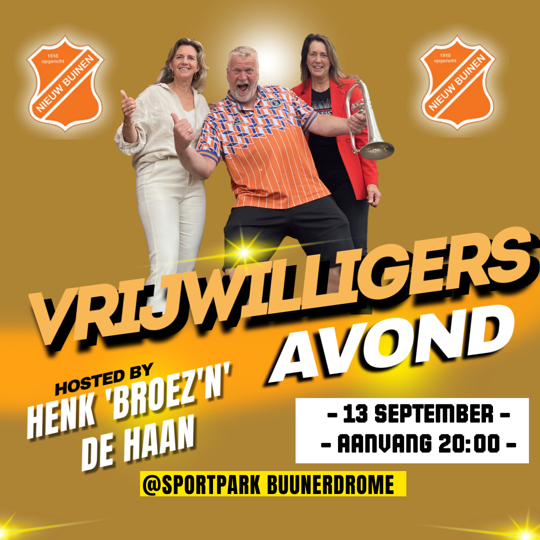 Bij deze nodigt het bestuur, als dank voor alle inzet en enthousiasme, alle vrijwilligers van vv Nieuw Buinen uit voor een gezellige vrijwilligersavond met een hapje en een drankje op vrijdag 13 september vanaf 20:00 uur (inloop vanaf 19:30 uur)